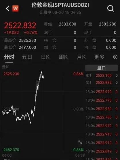 据人民日报客户端援引澎湃新闻报道,8月20日,万得数据(Wind)显示,现货黄金(伦敦金现,下同)价格接连突破2500美元/盎司、2510美元/盎司和2520美元/盎司整数关口,连续创下历史新高,最高价一度涨至2525.23美元/盎司,为年初至今第25次刷新历史新高。