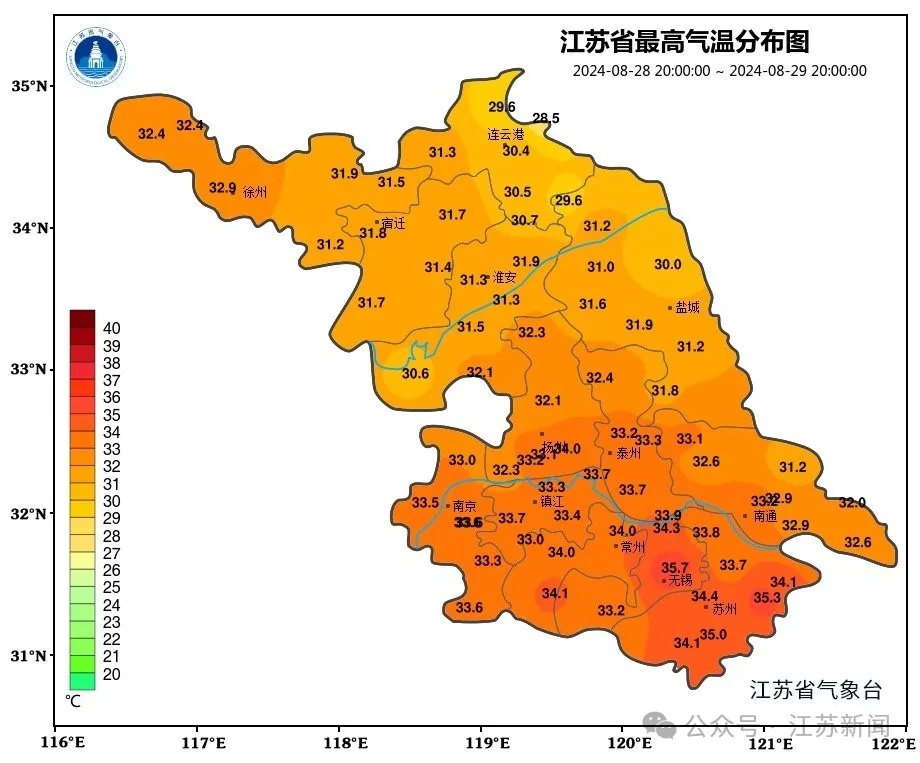 全省最高气温超过35℃ 前三名分别是: 无锡(35.7℃),昆山(35.3℃), 吴江(35℃)