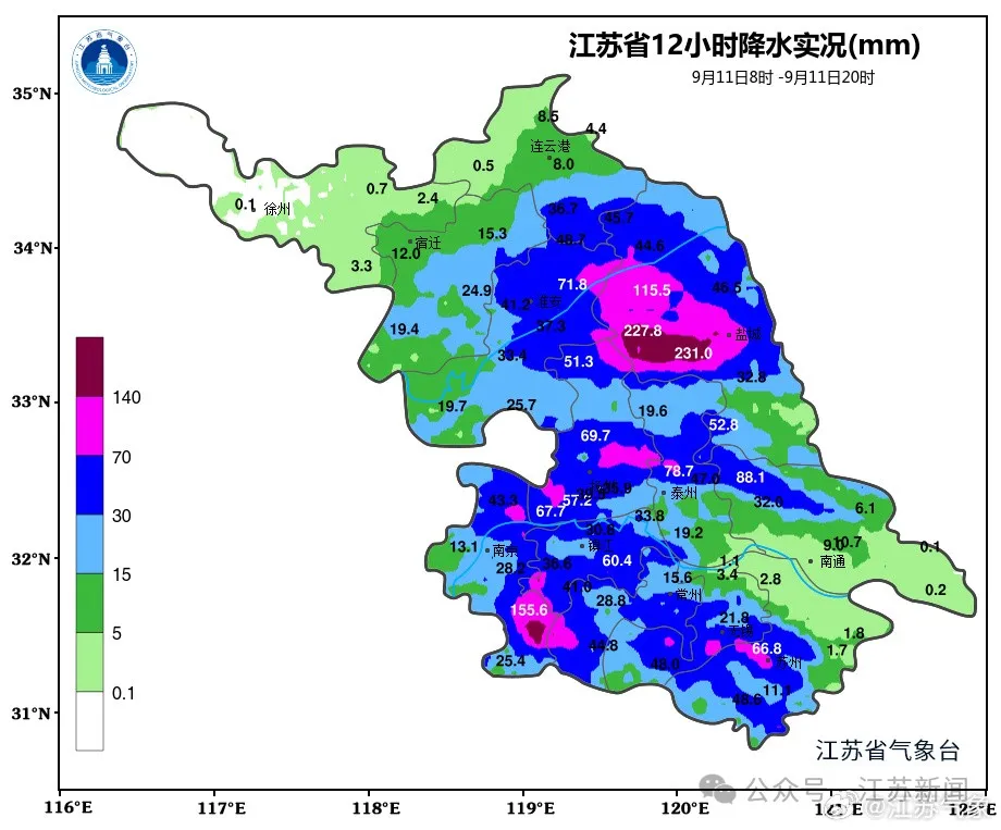 11日08时-20时,盐城、南京、常州等11个市的374个站的降水量达到50mm以上(占全省18.61%),前3位均在盐城市盐都区,分别是学富镇322.3mm、学富镇中徐村281.8mm、秦南镇东方红村253.1mm。南通、常州、无锡等5个市的6个站的极大风达到8级以上,前3位分别是南通市如东长沙镇海堤19.5m/s(8级,10时21分)、常州市武进区太湖焦山18.3m/s(8级,16时46分)、无锡市滨湖区太湖仙岛18.1m/s(8级,12时43分)。
