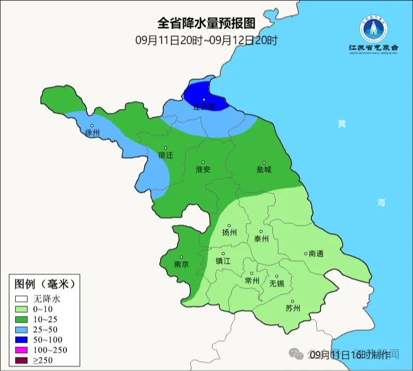 9月11日20时至9月12日20时,全省阴有阵雨或雷雨,其中沿淮和淮北地区雨量中等,局部大到暴雨,其他地区局部雨量中等