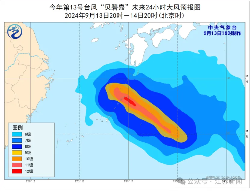 大风预报:9月13日20时至14日20时,东海东部海域将有6-8级、阵风9-10级的大风,“贝碧嘉”中心经过的附近海域或地区风力可达9-11级、阵风12-13级。