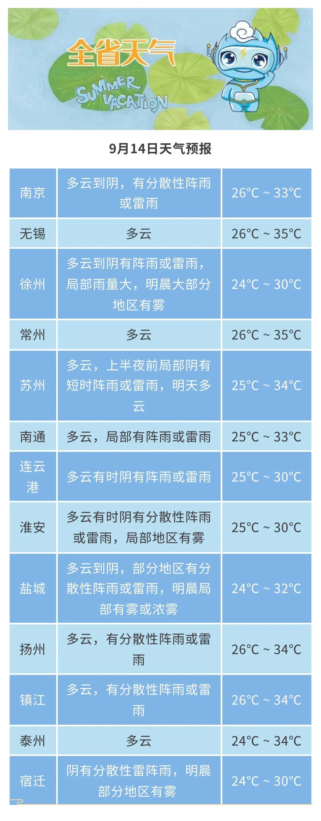 14日20时到15日20时:沿淮和淮北地区阴有阵雨或雷雨,局部中到大雨,其他地区多云。最高温度:沿江和苏南地区32~33℃,淮北北部地区26~27℃,其他地区28~29℃;最低温度:淮北地区21~22℃,本省东南部地区26~27℃,其他地区24℃左右。全省东北风4-5级阵风6级。