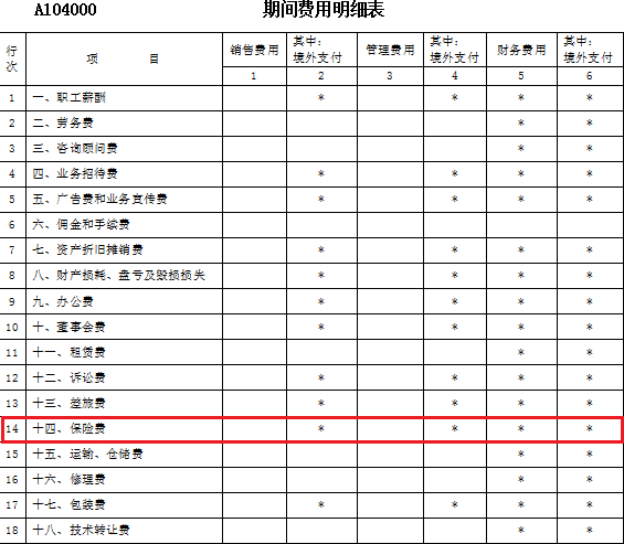 填报:第三到七条涉及A104000期间费用明细表第14行。