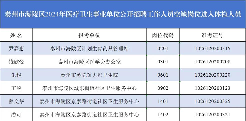 根据《泰州市海陵区2024年医疗卫生事业单位公开招聘工作人员空缺岗位公告》《泰州市海陵区2024年医疗卫生事业单位公开招聘工作人员公告(全年)》,按岗位招聘计划数1:1的比例从面试合格人员中按总成绩从高分到低分确定参加体检人员。现将进入体检人员名单及领取体检通知书有关事项公布如下: