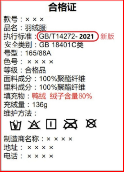 《羽绒服装》新国标用“绒子含量”替代了旧国标的“含绒量”。如果羽绒服上没有标明“绒子含量”四个字,那说明它很可能是存货。新国标还规定,羽绒服绒子含量不低于50%,在羽绒服中实际发挥保暖作用的是“绒子”,绒子含量越高保暖性相对越好,新国标可以更直观地判断羽绒服的保暖功效和羽绒品质高低,避免了厂家拿羽绒废料以次充好。