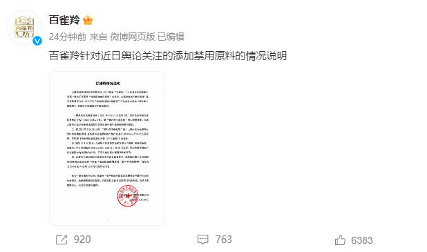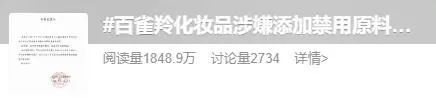 11月20日 #百雀羚化妆品涉嫌添加禁用原料基本属实# 话题登顶热搜 最新消息 刚刚,百雀羚发布针对近日舆论关注的添加禁用原料的情况说明: