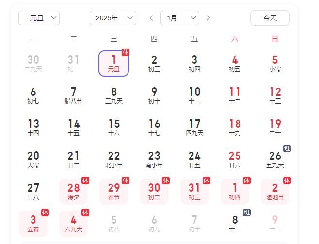2025年元旦1月1日(周三)