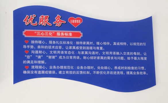 今年以来,泰州市殡仪馆(卧龙公墓)大力推进“减项降费优服务”工作,通过降低花圈、孝服、挽幛、鲜花花篮等多个收费项目,让殡葬服务回归本质,更具温度;通过服务礼仪标准化、文明用语常态化、业务办理规范化,不断优化并改进流程,提高业务效率,让家属感受到温暖与尊重。