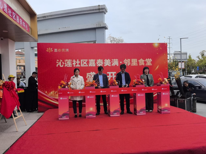 01 政企携手,共筑“家门口的美食地标” 开业典礼上,嘉泰美满运营总监陈冰洁首先致辞。她表示:“养老助餐,关乎民生,暖在民心。随着社区老龄化程度不断加深,老年朋友‘就餐难、吃饭愁’的问题一直牵动着我们的心。嘉泰美满始终坚守‘有家有美满’的核心理念,以长者需求为中心,用心打造‘家门口的美满生活’。今天沁莲社区邻里食堂的落地,正是我们回应居民期盼、服务民生实事的具体实践。” 她同时介绍了食堂的服务承诺:“我们将严格把控食材安全、科学搭配营养膳食、用心优化就餐服务,致力于为社区长者提供干净、卫生、营养、便捷的餐食,让大家吃得安心、吃得健康、吃得暖心。” 上午11时18分,嘉泰美满董事长申静先生、沁莲社区有关领导、金域维景田总、嘉泰美运营总监陈冰洁四位嘉宾共同执剪,在礼花与掌声中完成剪彩仪式。随后,申静董事长与社区有关领导共同为邻里食堂揭牌,红幕揭开,标志着沁莲社区嘉泰美满邻里食堂正式开门迎客。