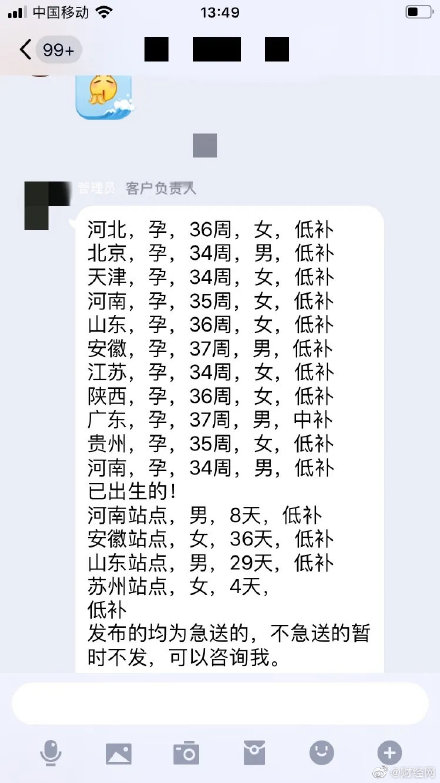 记者在知乎APP上以“送养”为关键词进行搜索,随即找到多条“送养小孩”信息。在多条信息下方,都有同一位网友称,自己已经“领到”了孩子,“订的时候孕妇才怀孕八个月,现在‘我女儿’一个多月,花了四万元。”经该网友介绍,有QQ群专门“提供送养、收养服务”。一位名为“客户负责人”的管理员在群里发送了一份名单:“河北,孕,36周,女,低补……广东,孕,37周,男,中补……”记者了解到,所谓“补”,意即“补偿款”。某种意义上说,也可以理解为送养者开出的“价格”。相应地,“低补”即为“补偿款”低。