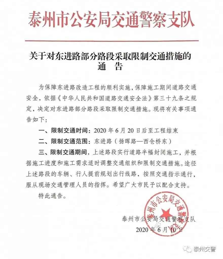 今天,泰州交警发布通告,6月20日后,海陵区东进路部分路段,采取限制交通措施。
