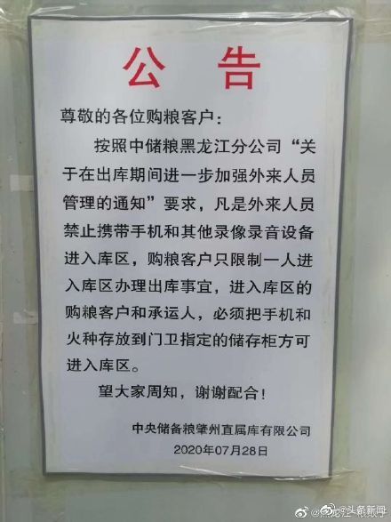 情况说明称,针对前期粮食销售出库过程中个别客户“以点概面、影响舆论”的行为,中储粮黑龙江分公司对直属库加强出库期间现场管理提出了相关工作要求。该公司称,由于对直属企业指导不够、工作考虑不细,发生了肇州直属库对外发布公告,简单机械规定禁止携带手机进入库区的事件,一定程度上造成隐瞒回避粮食出库作业情况的印象。