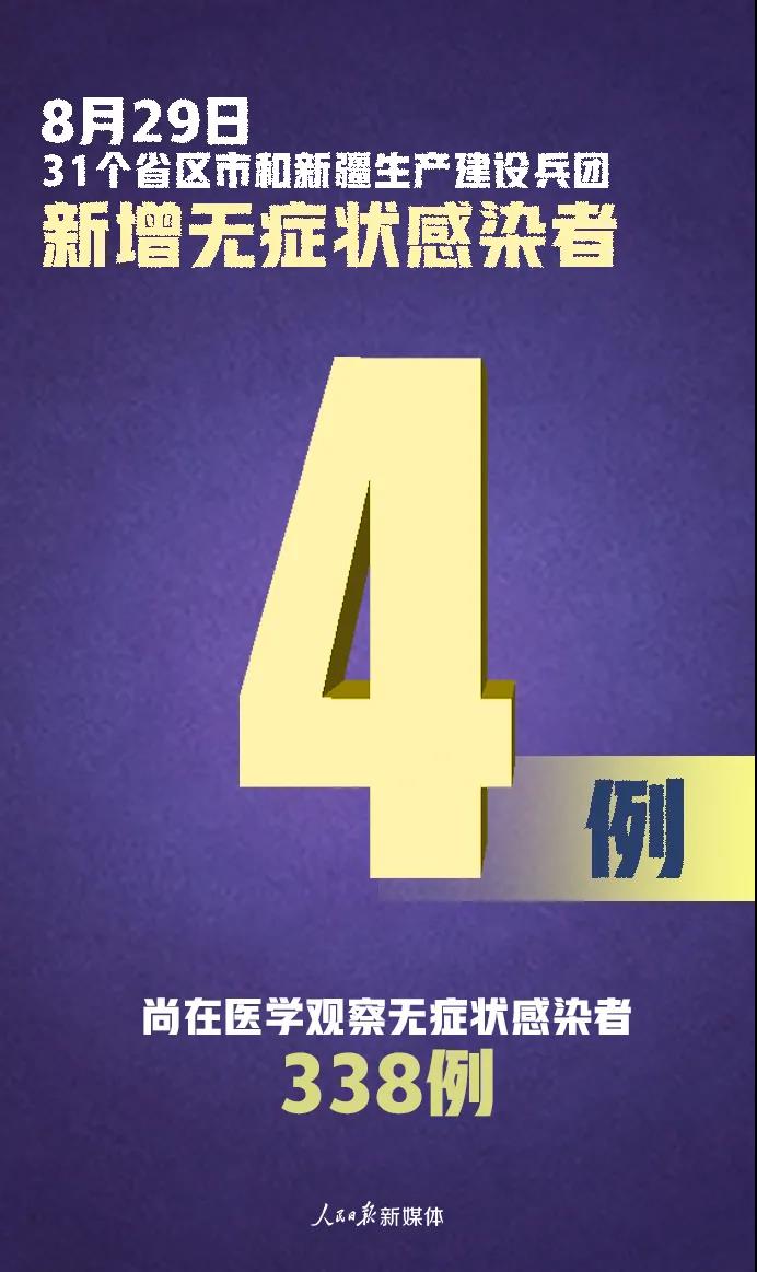 31个省(自治区、直辖市)和新疆生产建设兵团报告新增无症状感染者4例(均为境外输入);当日无转为确诊病例;当日解除医学观察17例(境外输入10例);尚在医学观察无症状感染者338例(境外输入305例)。