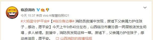 废墟下一幕让人泪目!据@临汾消防 消息,在救援现场,消防员在废墟下发现,一名父亲紧紧地抱着一名婴儿,竭尽全力保护自己的孩子