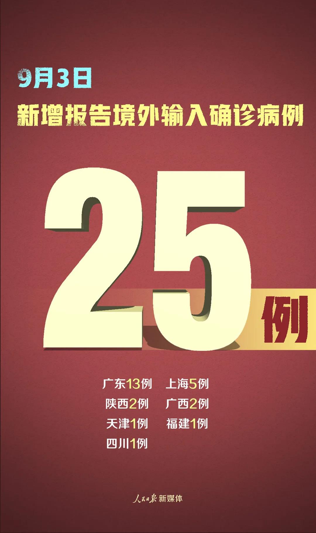 9月3日0—24时,31个省(自治区、直辖市)和新疆生产建设兵团报告新增确诊病例25例,均为境外输入病例(广东13例,上海5例,广西2例,陕西2例,天津1例,福建1例,四川1例);无新增死亡病例;无新增疑似病例。