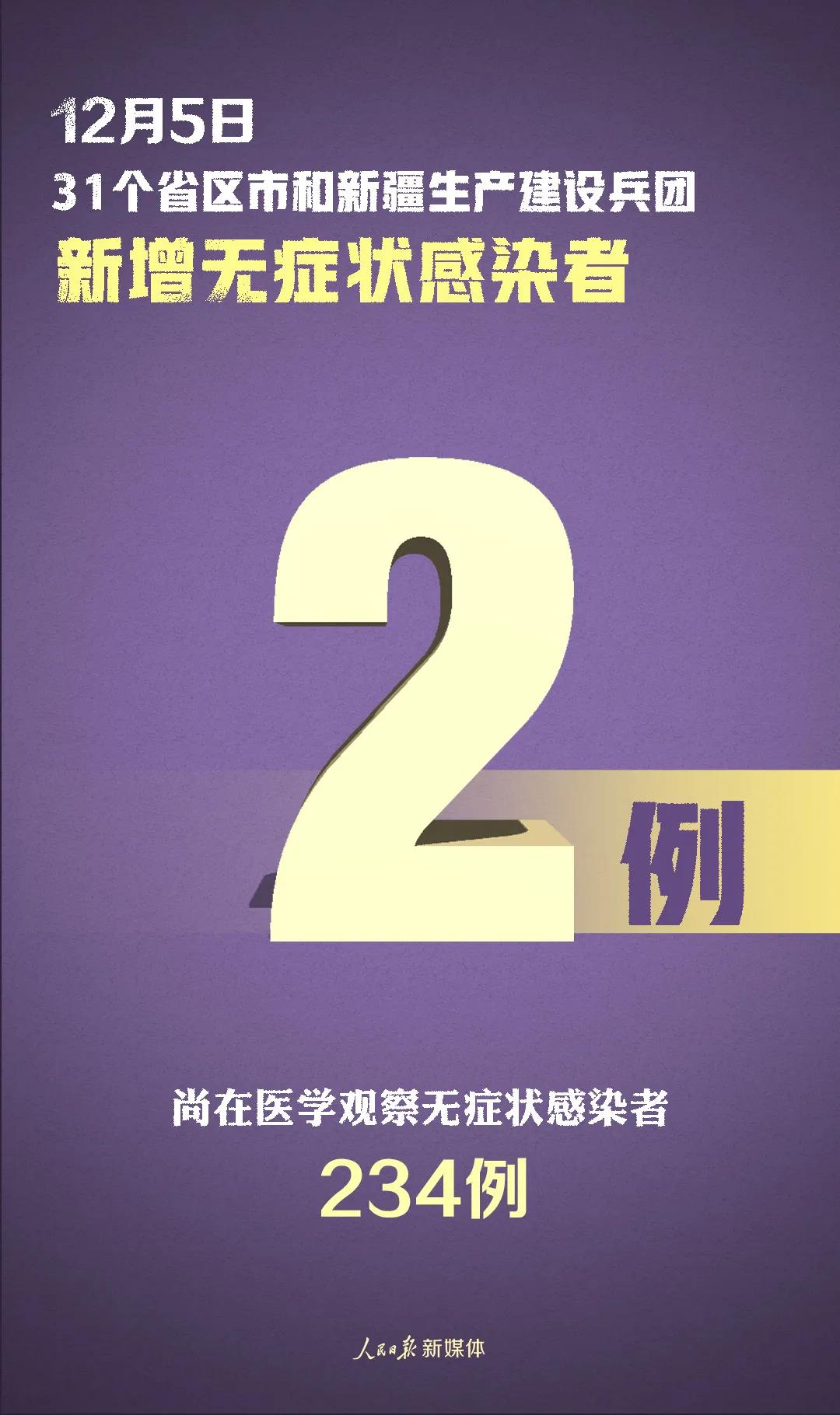 12月5日0—24时,31个省(自治区、直辖市)和新疆生产建设兵团报告新增确诊病例18例,其中境外输入病例17例(上海6例,福建6例,广东2例,四川1例,云南1例,陕西1例),本土病例1例(在天津);无新增死亡病例;新增疑似病例2例,均为境外输入病例(均在上海)。