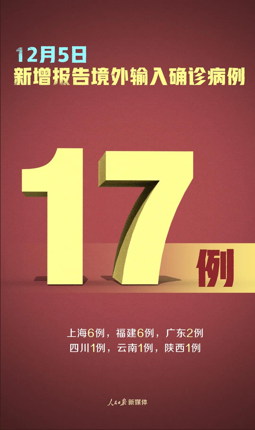 12月5日0—24时,31个省(自治区、直辖市)和新疆生产建设兵团报告新增确诊病例18例,其中境外输入病例17例(上海6例,福建6例,广东2例,四川1例,云南1例,陕西1例),本土病例1例(在天津);无新增死亡病例;新增疑似病例2例,均为境外输入病例(均在上海)。