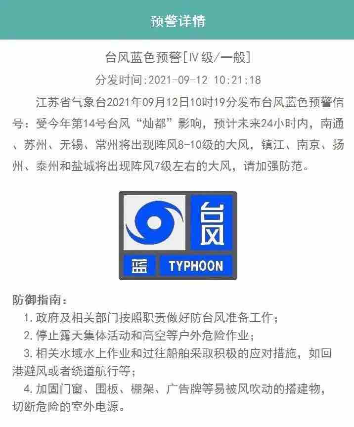 泰州市气象台9月12日11时发布的台风警报和天气预报: