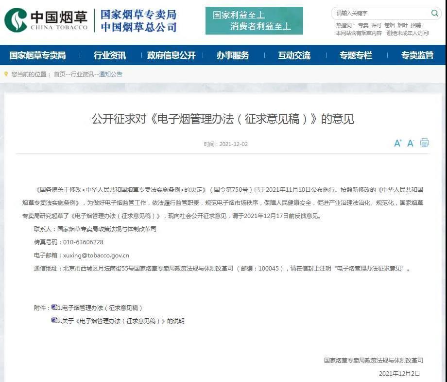 据国家烟草专卖局网站消息,按照新修改的《中华人民共和国烟草专卖法实施条例》,国家烟草专卖局研究起草了《电子烟管理办法(征求意见稿)》(以下简称《管理办法》),现向社会公开征求意见。其中: