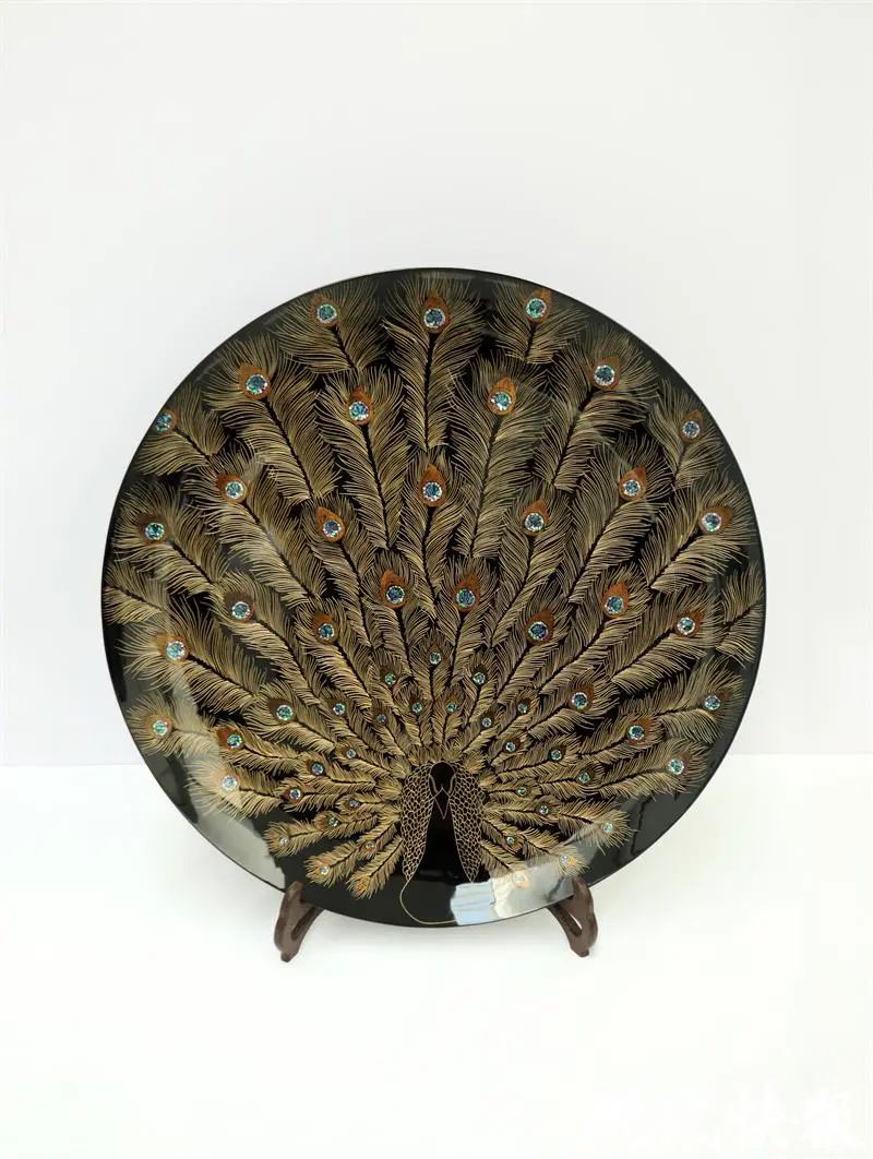 李文龙,2000年3月出生,山东潍坊人,2022届山东工艺美术学院漆艺专业应届毕业生。直径70厘米的漆盘中间,一只栩栩如生的开屏孔雀,正昂首挺胸,尽情展示着自己五彩缤纷的尾羽。定睛细瞧,每一根羽毛都遒劲有力,感觉随时都可能走出漆盘……这就是李文龙耗时5个多月完成的毕业设计——《孔雀屏深扇影开》。