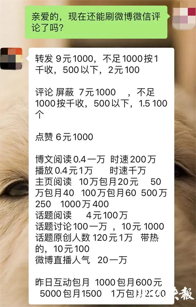记者添加了一名商家好友后,表示自己想要刷微博的评论和点赞。对方立即发来一份价目表,包含了转发、点赞、话题阅读、话题讨论、话题原创人数等各项目,就连直播人气都可以刷。记者注意到,仅需 6 元就可买 1000 个赞,7 元即可屏蔽 1000 条评论,9 元就可获取 1000 的转发量。话题阅读数是衡量是否可以上微博热搜的关键数据,而在商家那里,4 元就可轻易买到 100 万话题阅读数。