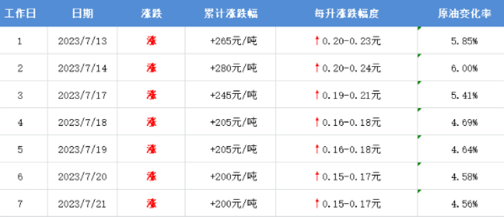 7月24日,第8个工作日,参考原油变化率为4.95%,预计汽柴油上调215元/吨,折算为0.17-0.18元/升,调价日期为:7月26日24时。按50升的油箱计算,加满需要多出大概9元的成本。
