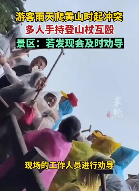 7月23日,网友爆料称,下雨天登黄山的途中,有多名游客发生冲突,持登山杖互殴。