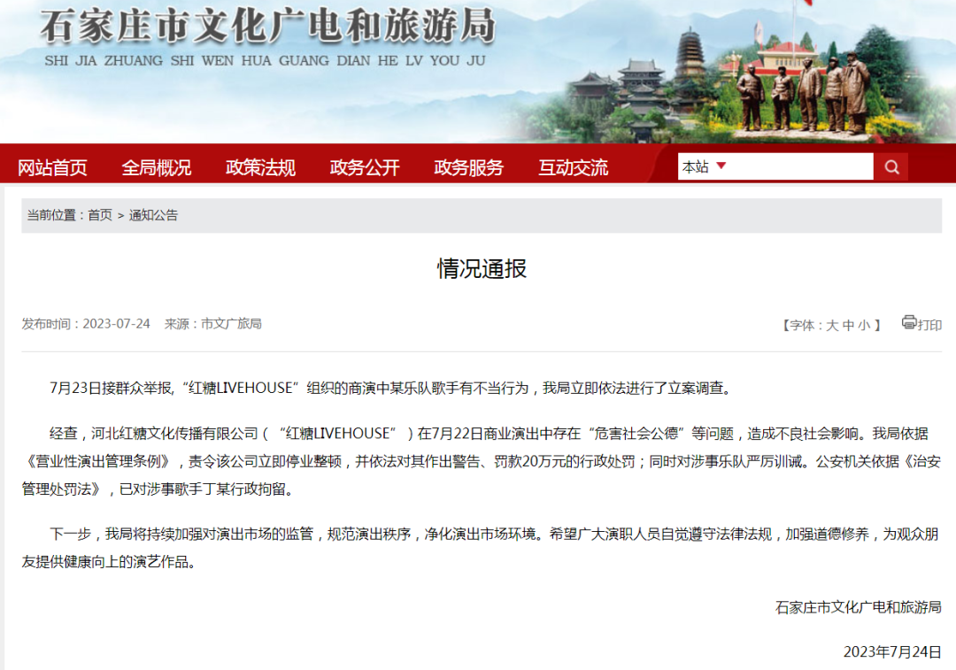 7月23日接群众举报,“红糖LIVEHOUSE”组织的商演中某乐队歌手有不当行为,我局立即依法进行了立案调查。