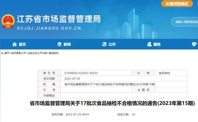 近期 江苏省市场监督管理局 组织食品安全抽检 抽取14大类食品535批次样品 检出炒货食品及坚果制品、餐饮食品 糕点、蔬菜制品、食用农产品和饮料等 6大类食品17批次样品不合格 其中包括 泰州市非梵食光商贸有限公司销售的 醉食尚花生(五香味) 泰州市江苏世纪华联超市 靖江刘金珠加盟店销售的 凉拌海蜇(自制) 具体情况通告如下 ▼ 一、无锡市锡山区陈大哥餐厅使用的复用餐饮具(餐盘),阴离子合成洗涤剂(以十二烷基苯磺酸钠计)不符合食品安全国家标准规定。