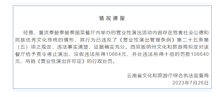 据“云南省文化和旅游厅”26日消息云南省文化和旅游厅综合执法监督局发布情况通报: