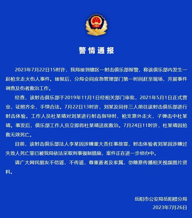 7月26日,湖南省岳阳市公安局岳阳楼分局官微发布通报: 2023年7月22日15时许,我局接到辖区一射击俱乐部报警,称该俱乐部内发生一起枪支走火伤人事件。接报后,分局会同应急管理部门第一时间赶至现场,开展事件调查及伤者救治工作。 经查,该射击俱乐部于2019年11月1日经相关部门审批,2021年5月1日正式营业,证照齐全,手续合法。7月22日13时许,刘某及同伴三人前往该射击俱乐部进行射击体验。工作人员杜某靖对刘某进行射击指导时,枪支意外走火,子弹击中杜某靖。事发后,俱乐部工作人员立即将杜某靖送医救治。7月24日11时许,杜某靖因抢救无效死亡。 目前,该射击俱乐部法人李某因涉嫌重大责任事故罪,射击体验者刘某因涉嫌过失致人死亡罪已被该局依法采取刑事强制措施,案件正在进一步侦办中。 请广大网民朋友不信谣、不传谣,尊重逝者及家属,勿随意传播相关视频图片资料。 |