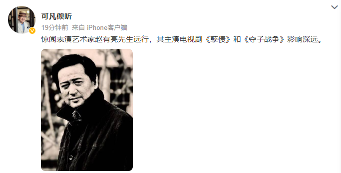 7月26日,主持人曹可凡“@可凡倾听”微博发文,曾主演《孽债》《夺子战争》等经典作品的著名演员赵有亮去世,终年79岁。