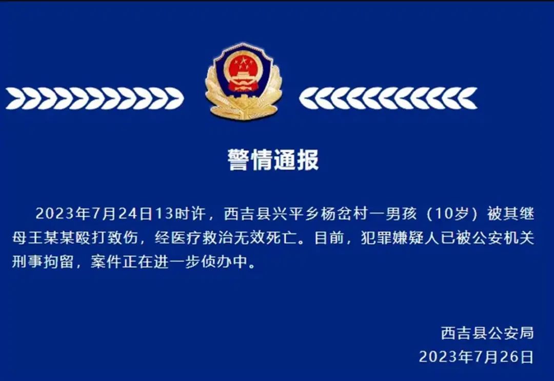 7月26日晚,西吉县公安局发布警情通报称,2023年7月24日13时许,西吉县兴平乡杨岔村一男孩(10岁)被其继母王某某殴打致伤,经医疗救治无效死亡。目前,犯罪嫌疑人已被公安机关刑事拘留,案件正在进一步侦办中。