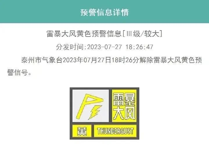 刚刚泰州市气象台2023年07月27日18时26分解除雷暴大风黄色预警信号