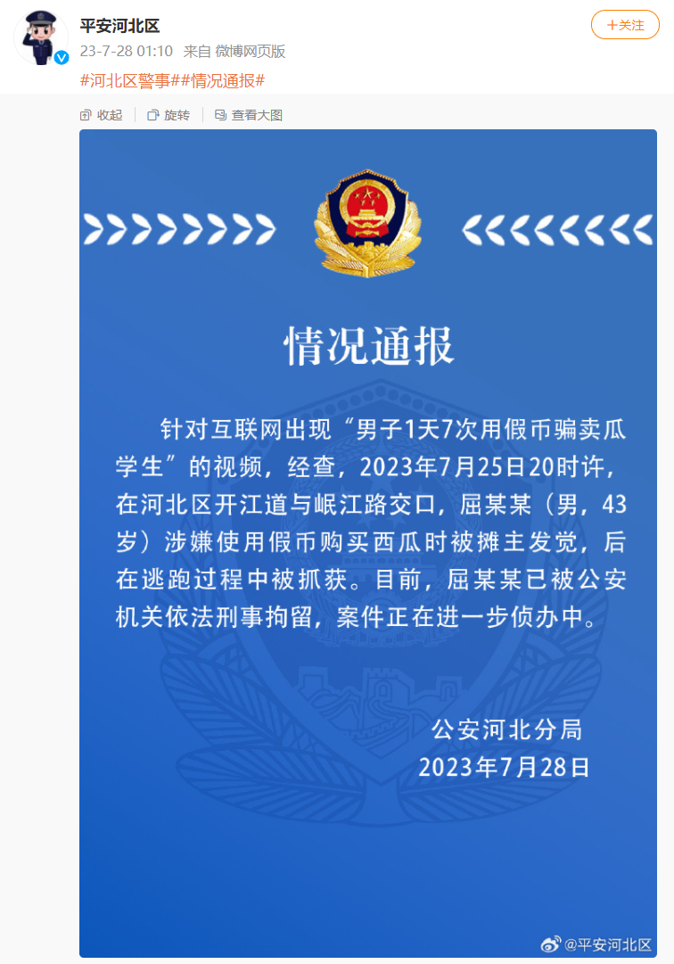 针对互联网出现“男子1天7次用假币骗卖瓜学生”的视频,经查,2023年7月25日20时许,在河北区开江道与岷江路交口,屈某某 (男,43岁) 涉嫌使用假币购买西瓜时被摊主发觉,后在逃跑过程中被抓获。目前,屈某某已被公安机关依法刑事拘留,案件正在进一步侦办中。