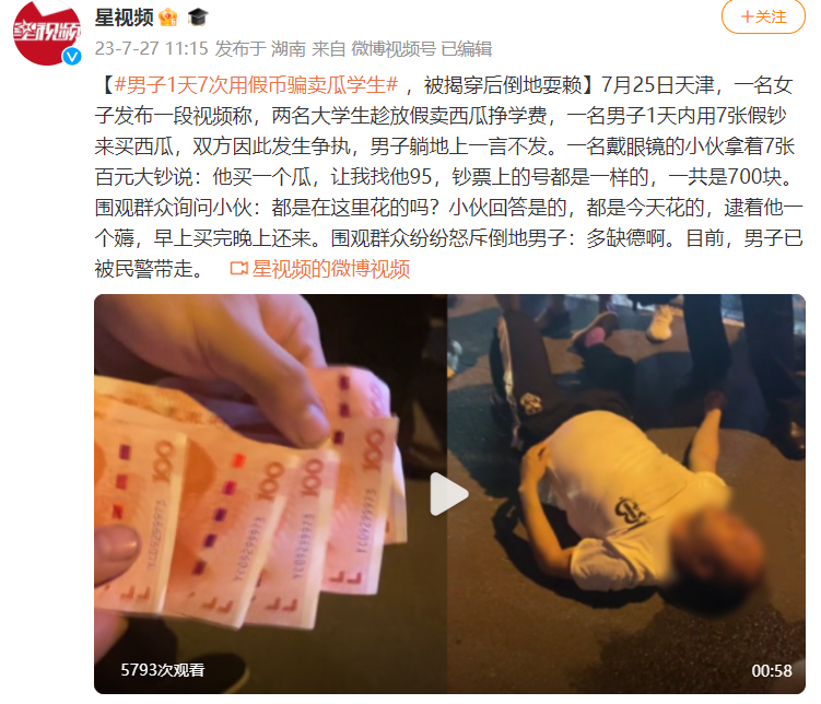 男子1天7次用假币骗卖瓜学生 ,被揭穿后倒地耍赖