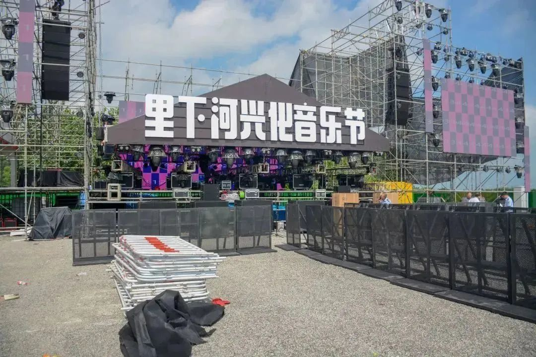 7月27日上午 里下河音乐节举办场地内 各项筹备工作皆已进入尾声 宣传海报醒目张贴 背景舞台框架已全面完成 场地布置效果基本呈现 承办方正加快推进扫尾工作 努力为广大市民 带来别样震撼的视觉冲击