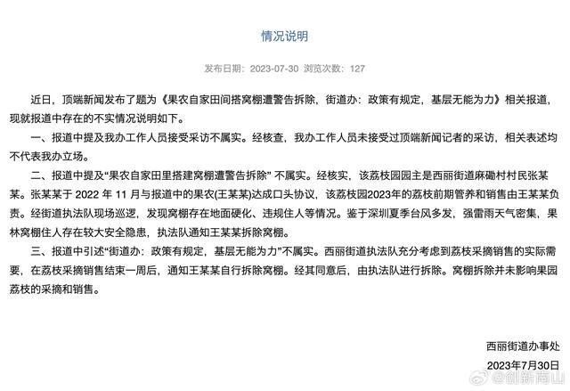7月30日,深圳市南山区西丽街道办事处就某客户端发布的《果农自家田间搭窝棚遭警告拆除,街道办:政策有规定,基层无能为力》相关报道进行情况说明。