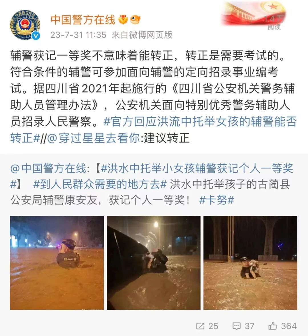 近日,四川泸州古蔺县辅警康安友在齐胸洪流中救被困小女孩获个人一等奖,网友点赞的同时表示希望这位辅警能够转正。