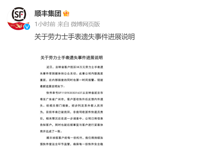顺丰在公告中说明称:“快件单号SF1159XXXXX1637从吉林省延吉市寄至广东省广州市,客户签收快件后反馈内件遗失。经相关部门调查,初步判定系外部人员所为,目前手表已被找回,非我司收派件快递员责任,相关情况还在进一步调查中。公司已将信息告知客户,同时也就后续事宜与客户进行妥善协商并达成了一致。”并表示后续“将持续加强快件营运全环节监管”。
