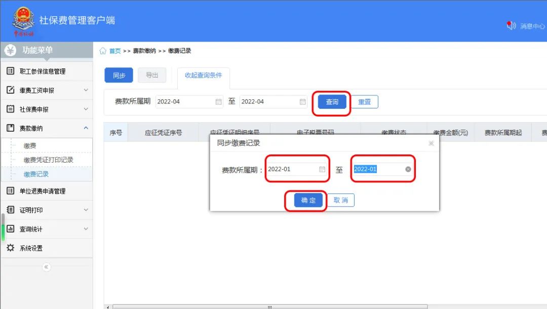 2.点击客户端左侧功能栏的“费款缴纳——缴费记录”模块,在弹出界面中,选择对应费款所属期如:“2022-01”,点击“同步”按钮。