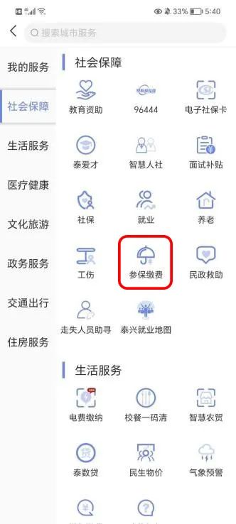 2.选择“社会保障”服务类别下“参保缴费”菜单。