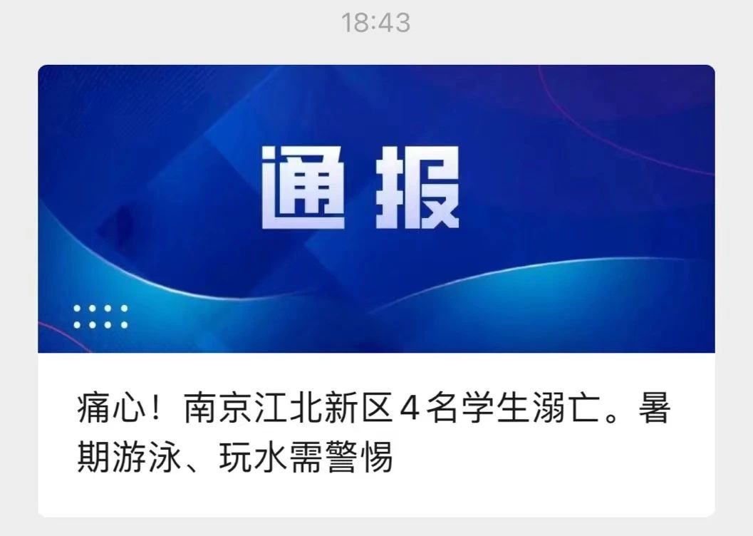 7月31日,南京江北新区发生一起溺水事件,造成4人身亡,遇难者皆为学生,目前善后事宜正在有序进行中。