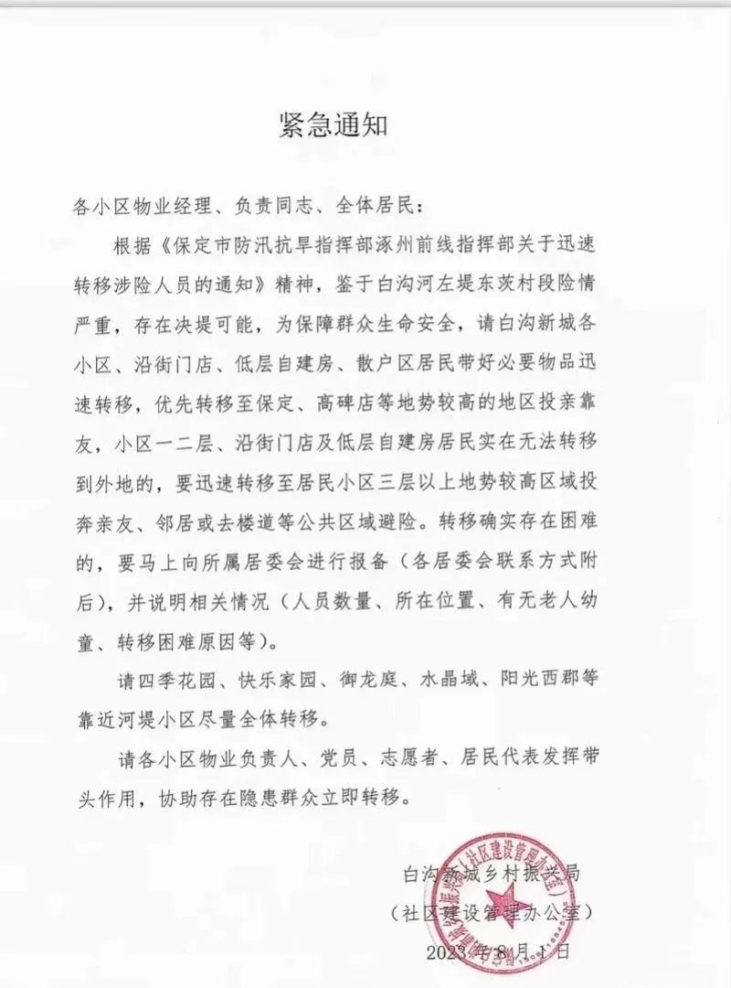 8月1日晚间,两张红头文件开始在网络流传。一张落款“保定市防汛抗旱指挥部涿州前线指挥部”的文件称:鉴于白沟河左堤东茨村段险情严重,存在决堤可能,按照保定市防汛抗旱指挥部部署,经市防指涿州前线指挥部会商分析研判,现建议你市提前果断转移白沟河左堤受威胁群众,做到应转尽转、应转早转,切实保障人民群众生命安全。