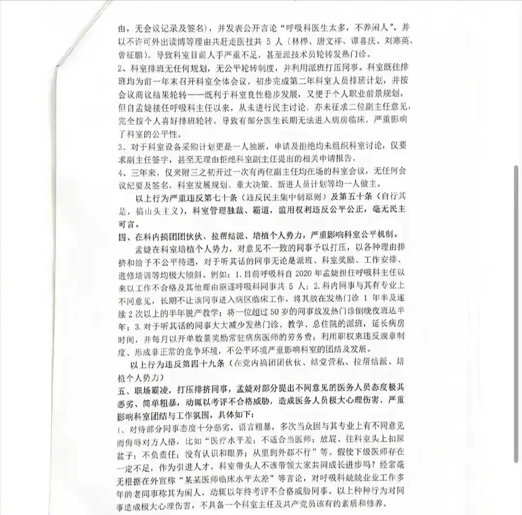 举报信称,2020年孟婕从湘雅医院调入湘雅三医院担任呼吸科主任,三年以来,她种种违纪违规行为层出不穷,已经严重影响呼吸科未来发展及声誉。这封长达五页纸的举报信,有理有据,罗列了该科室负责人九大违规问题