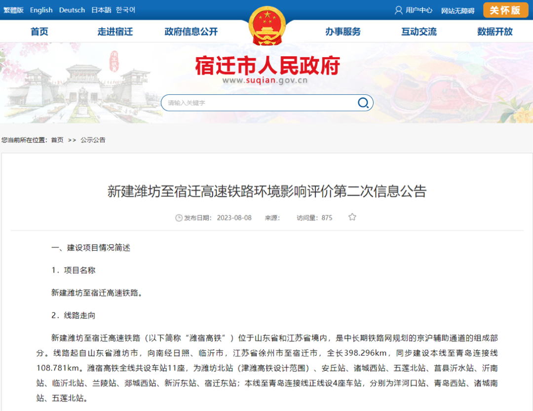 据公示信息,新建潍坊至宿迁高速铁路位于山东省和江苏省境内,是中长期铁路网规划的京沪辅助通道的组成部分。线路起自山东省潍坊市,向南经日照、临沂市,江苏省徐州市至宿迁市,线路全长398.296公里,同步建设本线至青岛连接线108.781公里。设计速度350公里/小时,建设工期4.5年