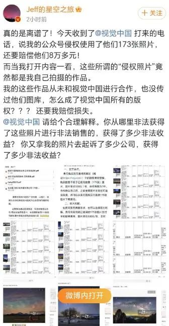 8月15日,星空摄影师戴建峰(@Jeff的星空之旅)发文称:“今天收到了视觉中国打来的电话,说我的公众号侵权使用了他们173张照片,还要赔偿他们8万多元!而当我打开内容一看,这些所谓的‘侵权照片’竟然是我自己拍摄的作品。”
