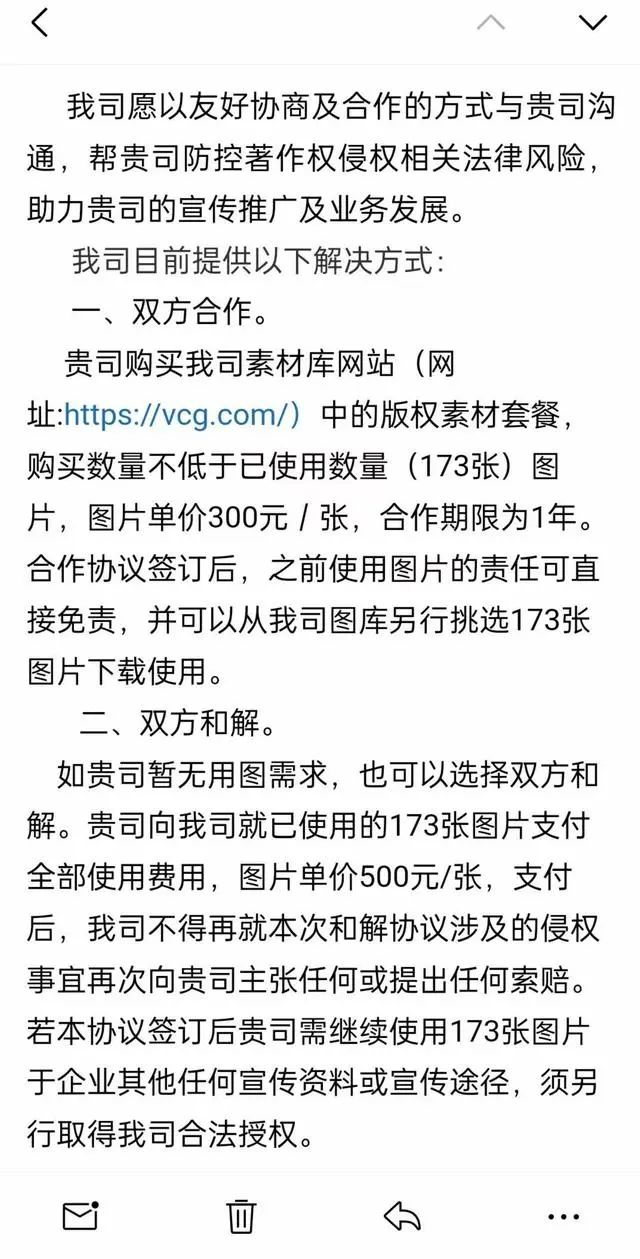 戴建峰介绍,视觉中国给了他两个解决方案,限期8月18日之前回复。第一是双方合作,由他购买视觉中国素材库网站中的版权素材套餐,购买数量不低于已使用数量(173张)图片,图片单价每张300元,合作期限为1年。合作协议签订后,之前使用图片的责任可直接免责。第二种方案则是双方和解,由他向视觉中国支付173张图片费用,每张500元,一共86500元。