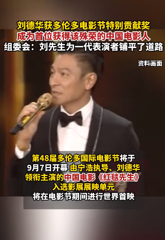 此外,电影节官网日程安排显示,刘德华还将于9月16日参加多伦多电影节的对谈单元,与全世界观众分享他作为演员、制片人、传奇歌手的经验,同时也将为大家介绍他的新作《红毯先生》。