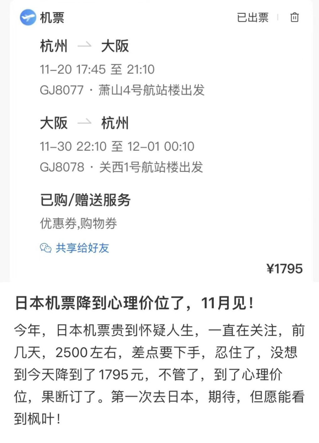 此外,新闻坊26日查看赴日机票时发现已经降价。此前部分过万的机票,如今已有明显下降。